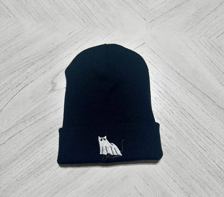 Embroidered Ghost Cat Beanie - Spooky Halloween Knit Hat