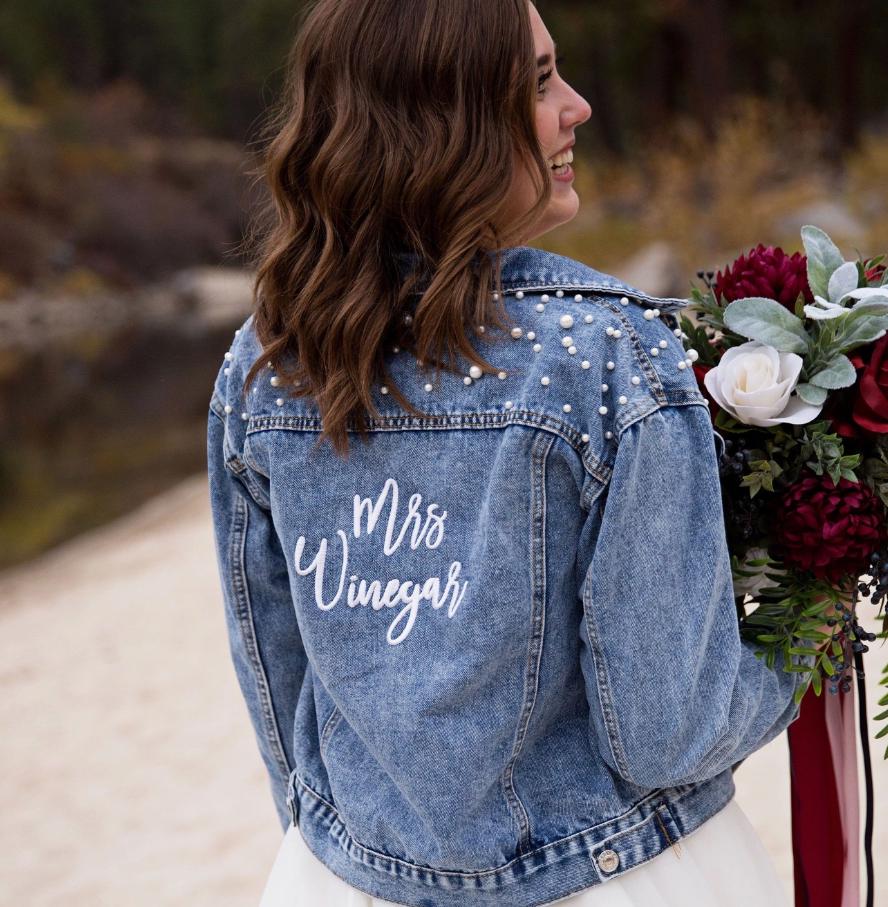 Make a statement on your special day with this Custom Embroidered Denim Jacket—the perfect keepsake for brides-to-be! Personalize it with "Bride," "Wifey," "Mrs. [Your Last Name]", or any text of your choice to create a one-of-a-kind piece.