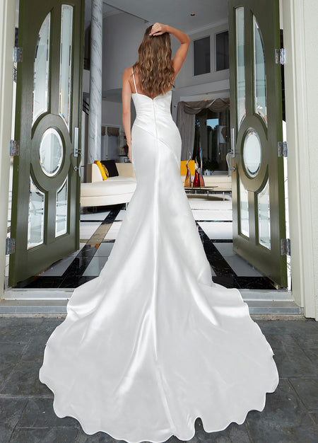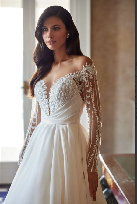 | Style 8279 stuns with its breathtaking blend of beaded lace and sparkling tulle, featuring a sultry plunging neckline, high slit, and graceful off-the-shoulder detachable sleeves (SL100). Every element—from the refined bodice to the airy skirt—comes together in striking harmony for a look that commands attention and radiates confidence | |