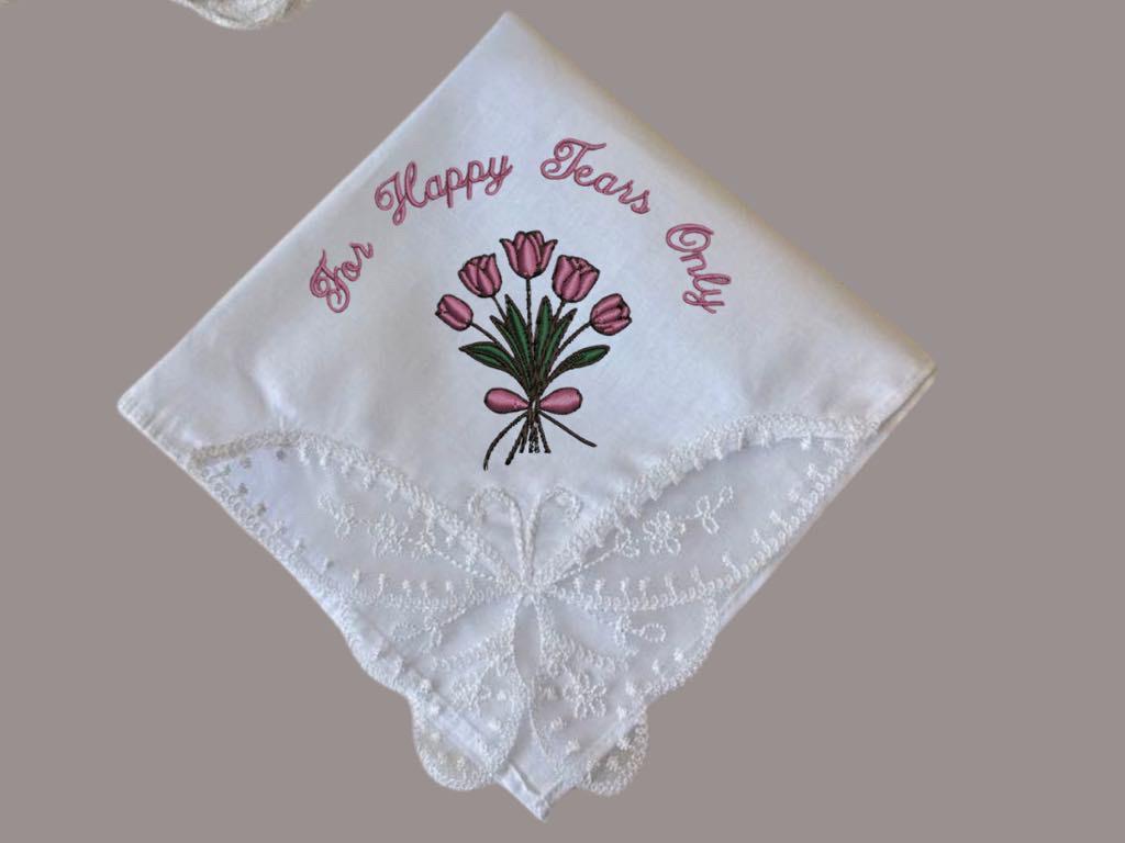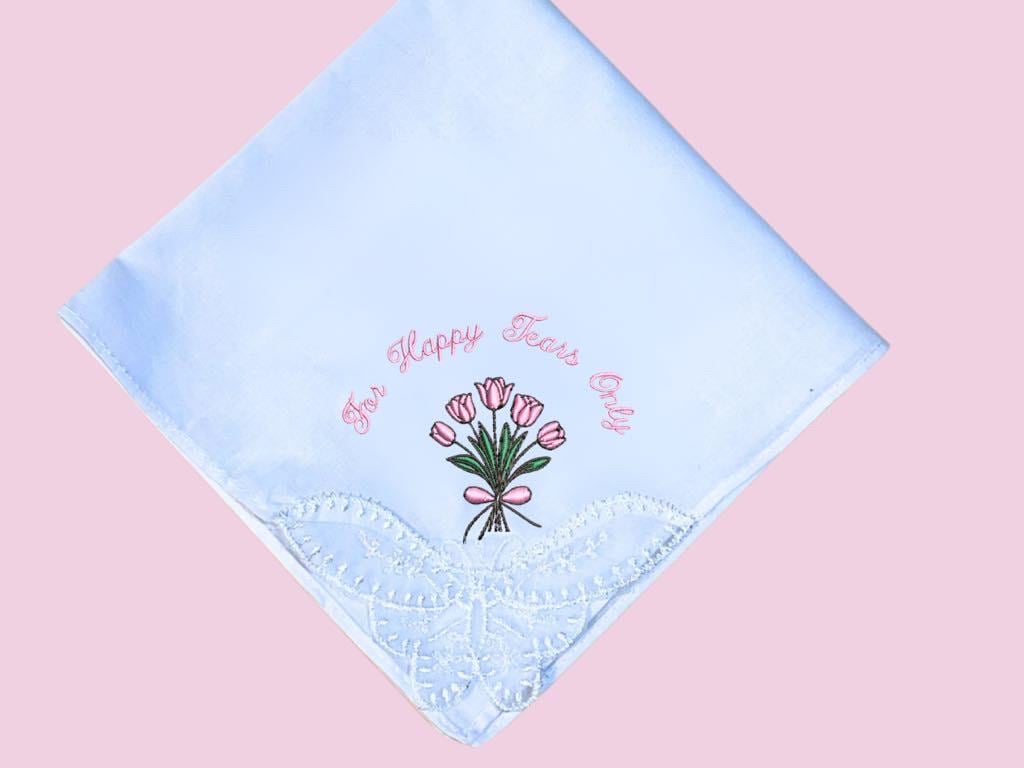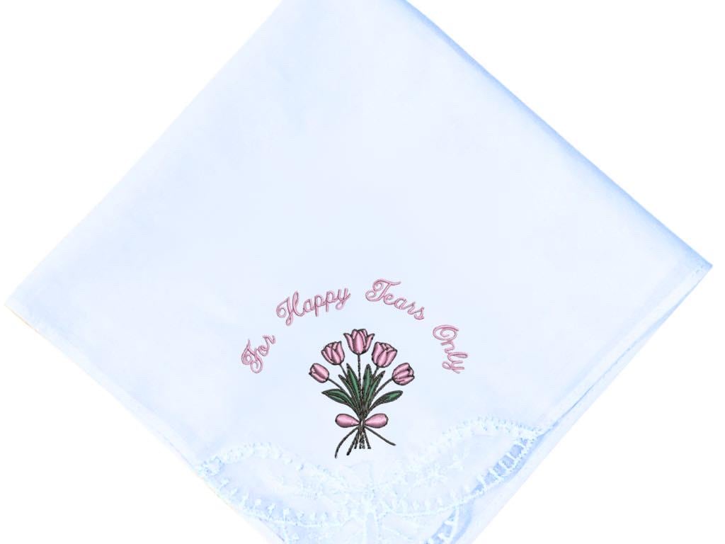 Our personalized “Happy Tears Only” handkerchief is a heartfelt keepsake for your most meaningful moments. Whether gifted to the bride, mother of the bride, groom, or any loved one, this delicate piece is embroidered with soft florals and the sweet sentiment “Happy Tears Only” — a timeless reminder of love, joy, and cherished memories.
