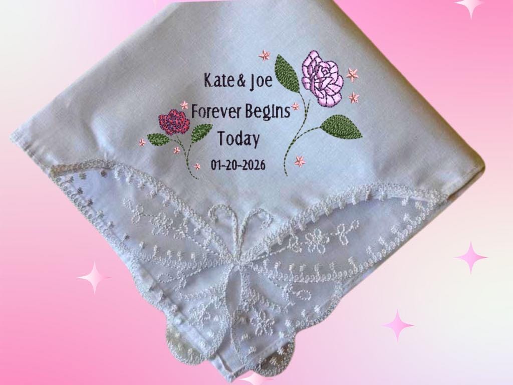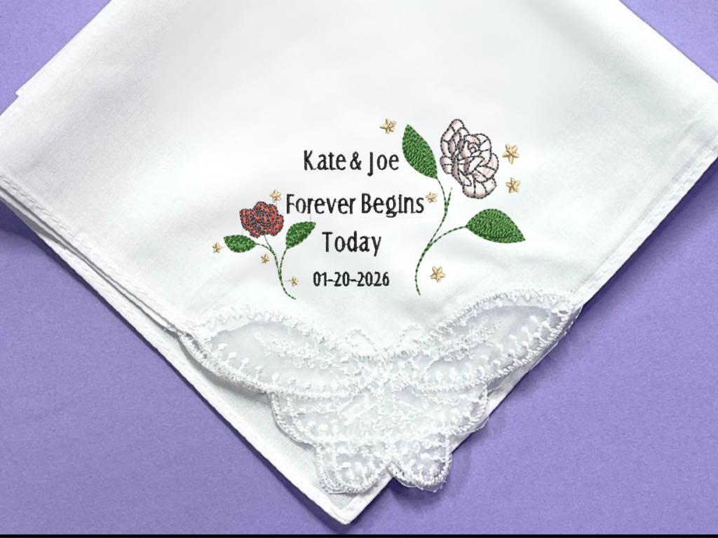 Our personalized “Forever Begins Today” handkerchief is a heartfelt keepsake for your most meaningful moments. Whether gifted to the bride, mother of the bride, groom, or any loved one, this delicate piece is embroidered with soft florals and the sweet sentiment “Forever Begins Today” — a timeless reminder of love, joy, and cherished memories.