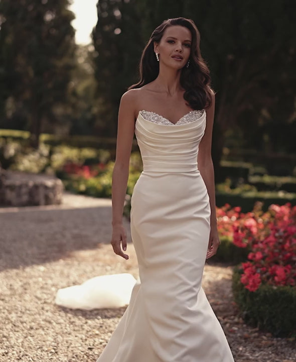 Strapless sweetheart neckline with delicate ruching, beautifully wrapping from front to back for a figure‑flattering look