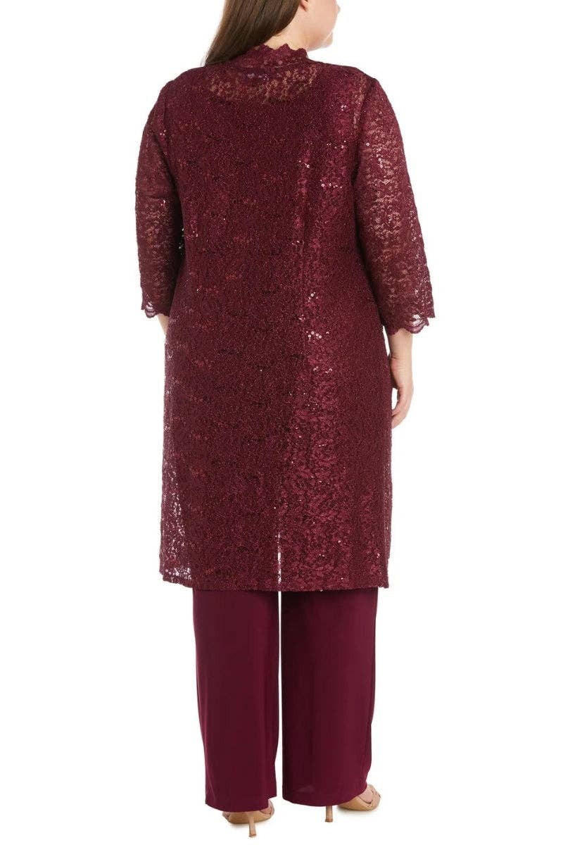 The R&M Richards Metallic Lace Tank Top and Pant Set with Sheer Lace Jacket (Plus Size) is a stylish and coordinated ensemble perfect for special occasions. This Wholesale R&M Richards Outfit Sets piece includes a shimmering metallic lace tank top and matching pants, complemented by a sheer lace jacket, creating an elegant and flattering look that’s ideal for formal gatherings.